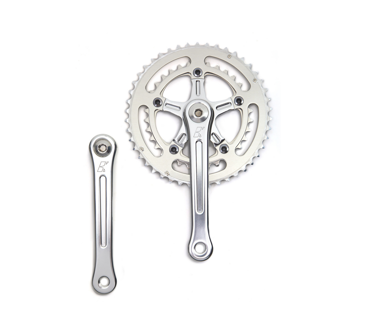 Enter the compact double: our crankset is built on the same handsome forging as the Bassi Narrow-Wide crank we've been using on many of our bikes, but uses a 46-tooth large and 34-tooth small chainring. This makes it far easier to use the big ring for most riding, then drop to the small for long climbs. Paired with an 11-34t cassette (within range of all nearly all current Shimano derailers, and I can personally attest you can sneak in a 36-tooth on some of them), you'll have 1:1 development on the easiest gear, which is enough for road climbs up to about 12% for most riders, while being able to use almost any shifting system off the shelf, no need to puzzle over capacities or chain lengths.