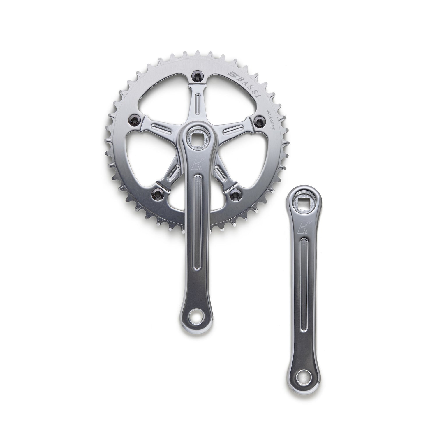 Our classic-looking Bassi crankset, thoroughly modern in its purpose and manufacture. We made this so that Bassi bikes could keep looking great with current 1x transmissions, with no chain-keeper or front derailer. The tooth pattern on the chainring will keep your chain in place, often even without a clutched rear derailer, but short chainstays or derailers with large pulleys or weaker springs may cause problems, so use a clutchless derailer at your own risk.