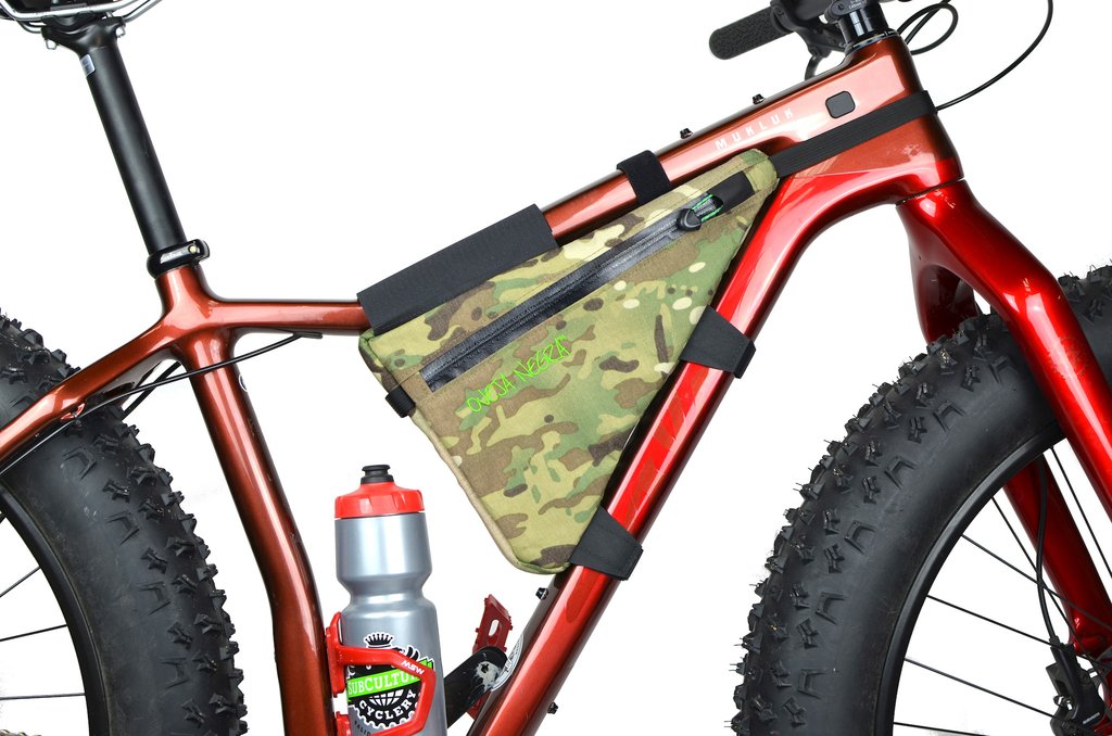 The Superwedgie™ is Oveja Negra’s wedge shaped frame bag that allows you to stow gear towards the front of your triangle while running a water bottle/cage along your seat tube.